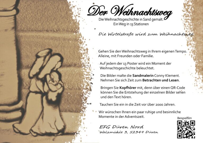 Ab Anfang Dezember finden sich in Schaufenstern der Wirtelstraße besondere Plakate. 13 an der Zahl erzählen sie fortlaufend von 1 bis 13 die Weihnachtsgeschichte. Das Besondere an den Plakaten ist das Sandpaintingbild. Über einen QR-Code auf den Plakaten erfährt man mehr dazu und sieht in einem kurzen Video, wie das Bild entstand.